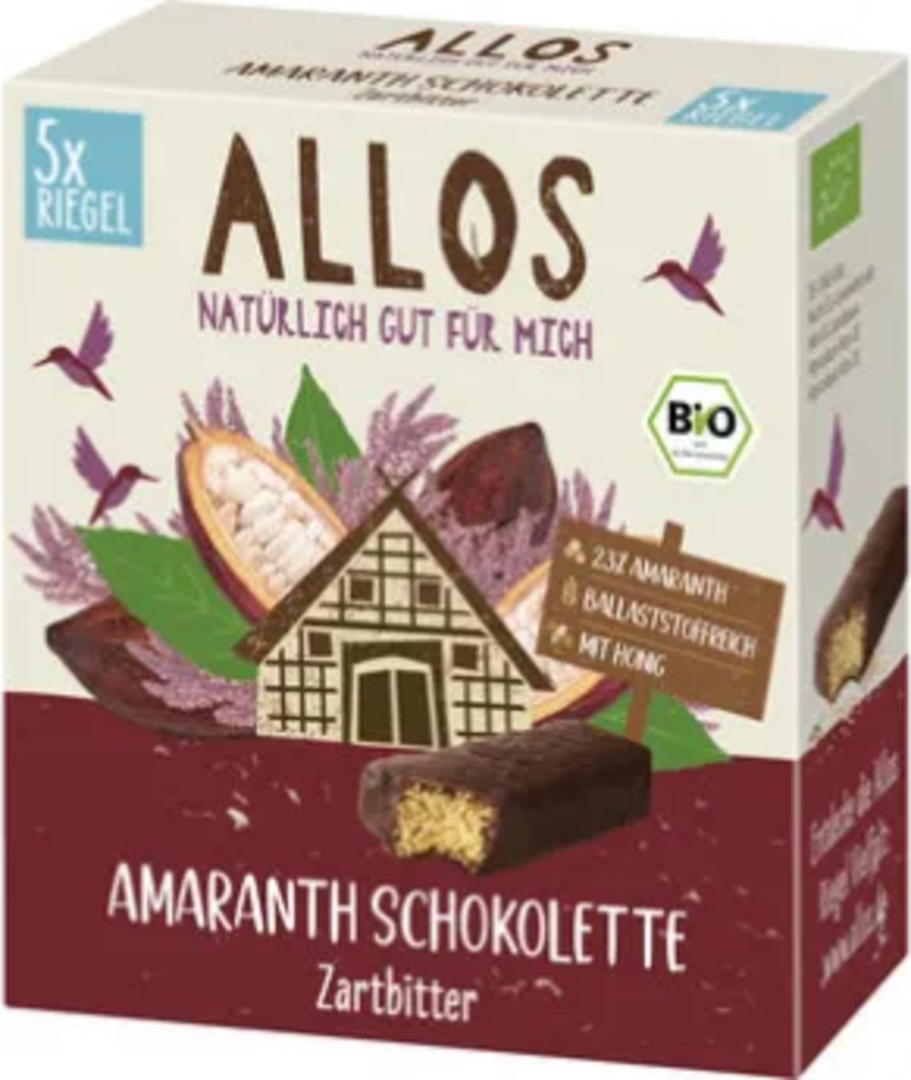 Amaranth Schokoletten - Dark Chocolate by ALLOS - delicious snack bars with a filling made of light popped amaranth sweetened with aromatic honey and covered in a crunchy layer of the finest dark chocolate. This delicious snack is the perfect way to satisfy your sweet tooth at any time.