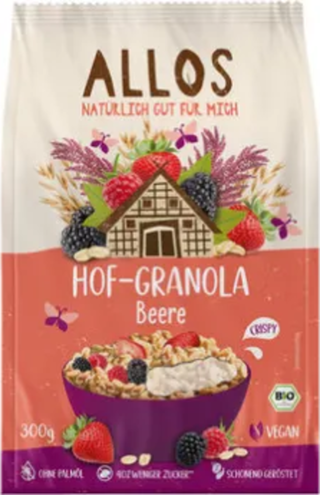 Enjoy a natural breakfast with the vegan granola by ALLOS. Flavourful oat flakes and wheat flakes along with fruity berries and sweetened with an alternative sweetener. Popped amaranth emphasises the crunchy cereal mix in your breakfast bowl. Gently roasted, free from palm oil and with 40% less sugar.