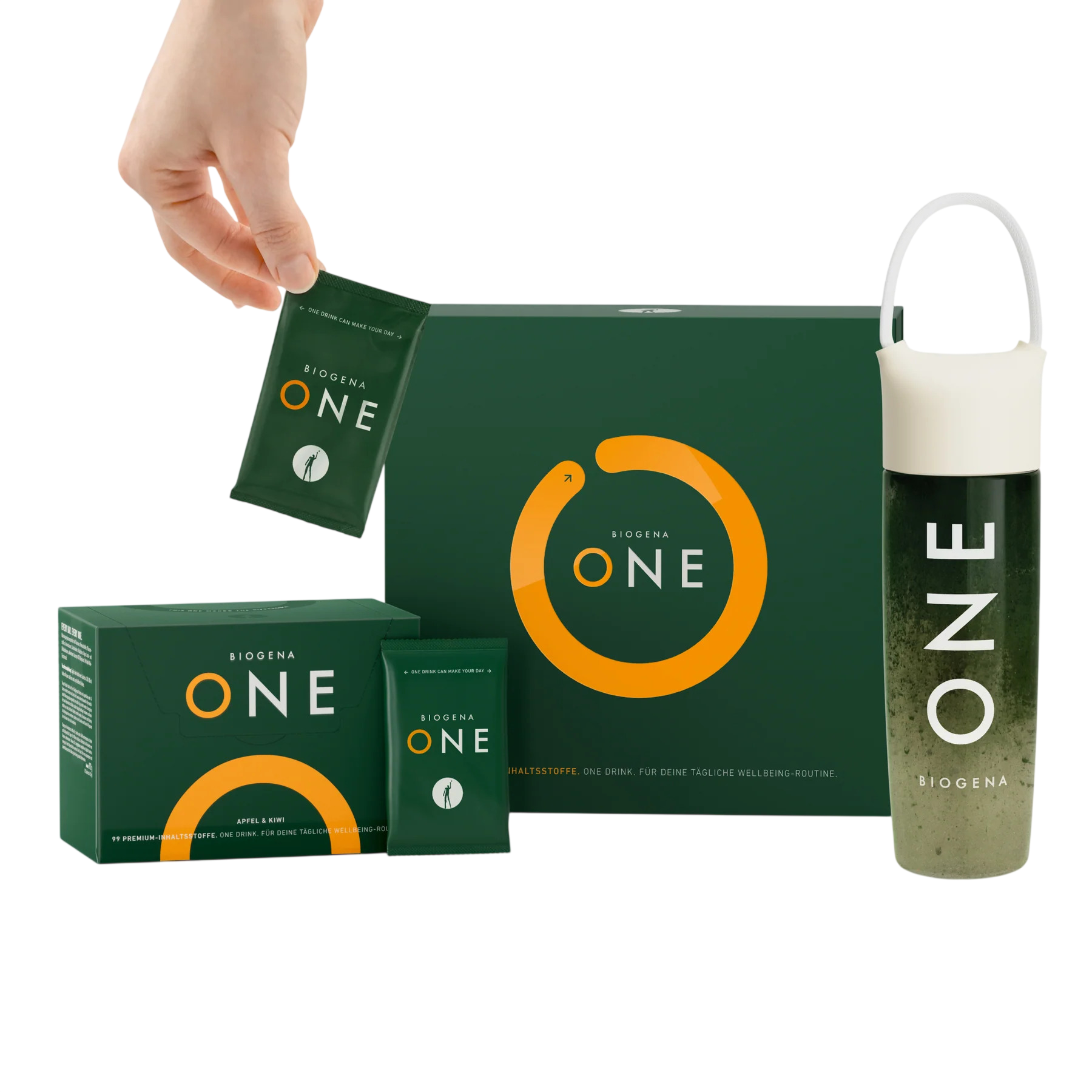 BIOGENA ONE is a next-gen green drink with a nutrient formulation of 99 valuable ingredients. The unique blend contains 13 vitamins, 11 minerals and trace elements, 10 lacto- and bifidobacteria cultures and 49 selected plant substances. These include grape, grape seed, pomegranate, olive leaf, blueberry, blackcurrant and citrus fruits which are a great source of valuable antioxidants. BIOGENA ONE also boasts a sensational taste - apple, kiwi, cucumber and a pinch of wasabi leaf powder turn your daily supply of nutrients into enjoyable, delicious moments. Carefully developed to support your daily diet.