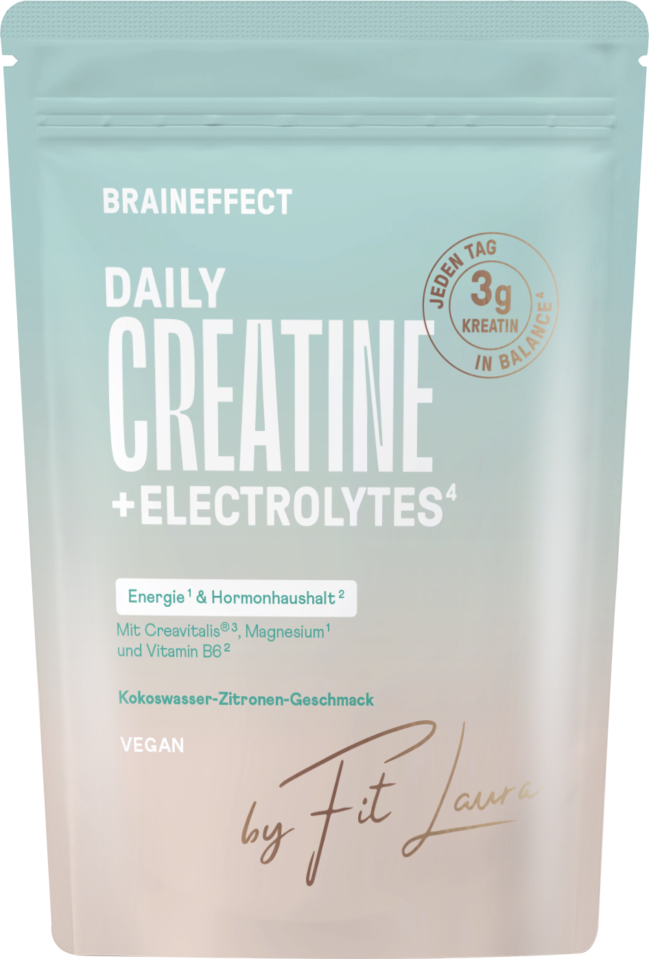 The Daily Creatine + Electrolytes with 3 g high-purity creatine (Creavitalis®) with coconut water-lemon flavour. The powder dissolves easily in water.
