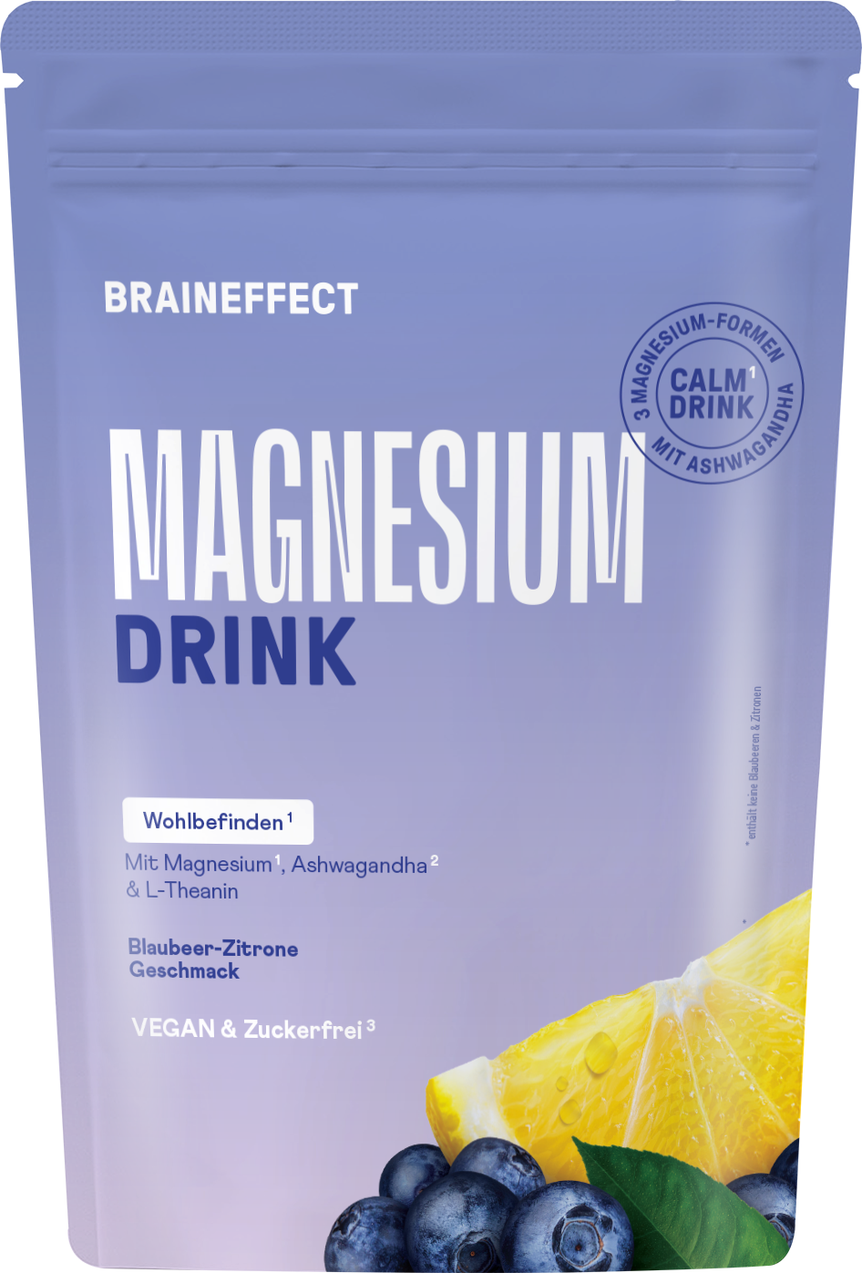 BRAINEFFECT Magnesium Drink contains three organic forms of magnesium: citrate, bisglycinate, and taurate. Magnesium contributes to normal muscle function. The powder also contains ashwagandha and L-theanine.