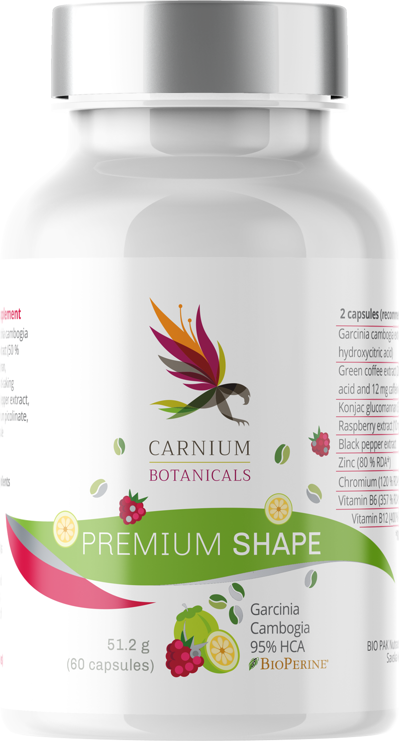 The Premium Shape Capsules by Carnium Botanicals contain extracts of black pepper and raspberries, along with vitamins and minerals. The formulation is vegan and free from preservatives.