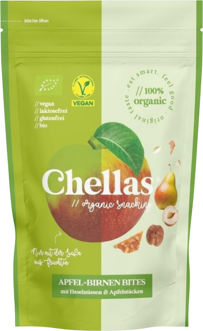 Chellas brings you a delicious snack with the mild sweetness of ripe apples and the tender aroma of juicy pears. Rounded out with crunchy hazelnuts and fine apple pieces, this snack has a full-bodied flavour you can enjoy at any time. Carefully handmade and packed in Austria, Chellas Bites are the perfect mindful, natural snack. The practical fresh-seal pack makes them ideal for on the go, in the office or at home.