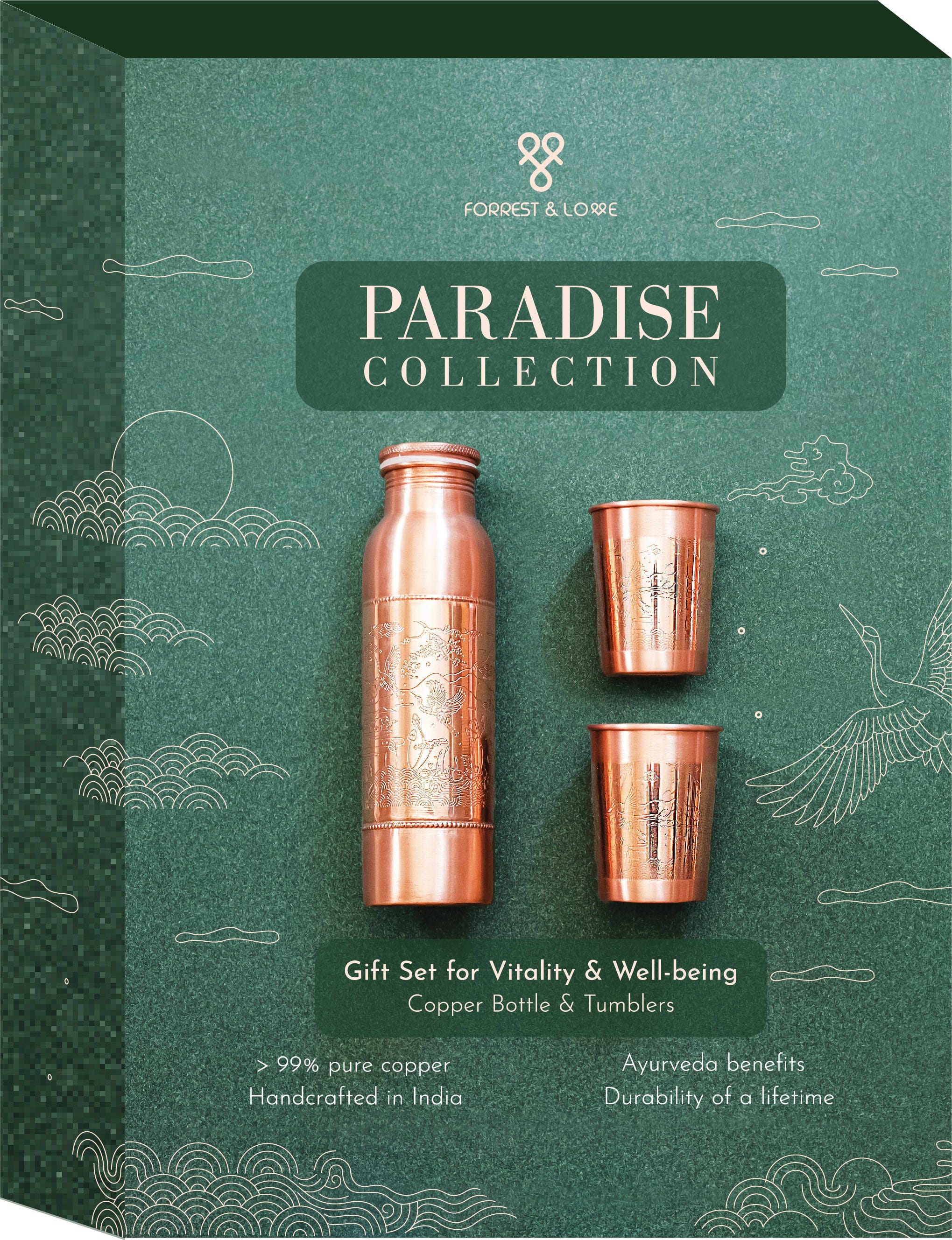 The paradise design was inspired by Japanese artwork and impresses with its beauty of finely engraved flowers and birds. The elegant and durable gift set combines an idyllic design with a unique water-drinking experience.