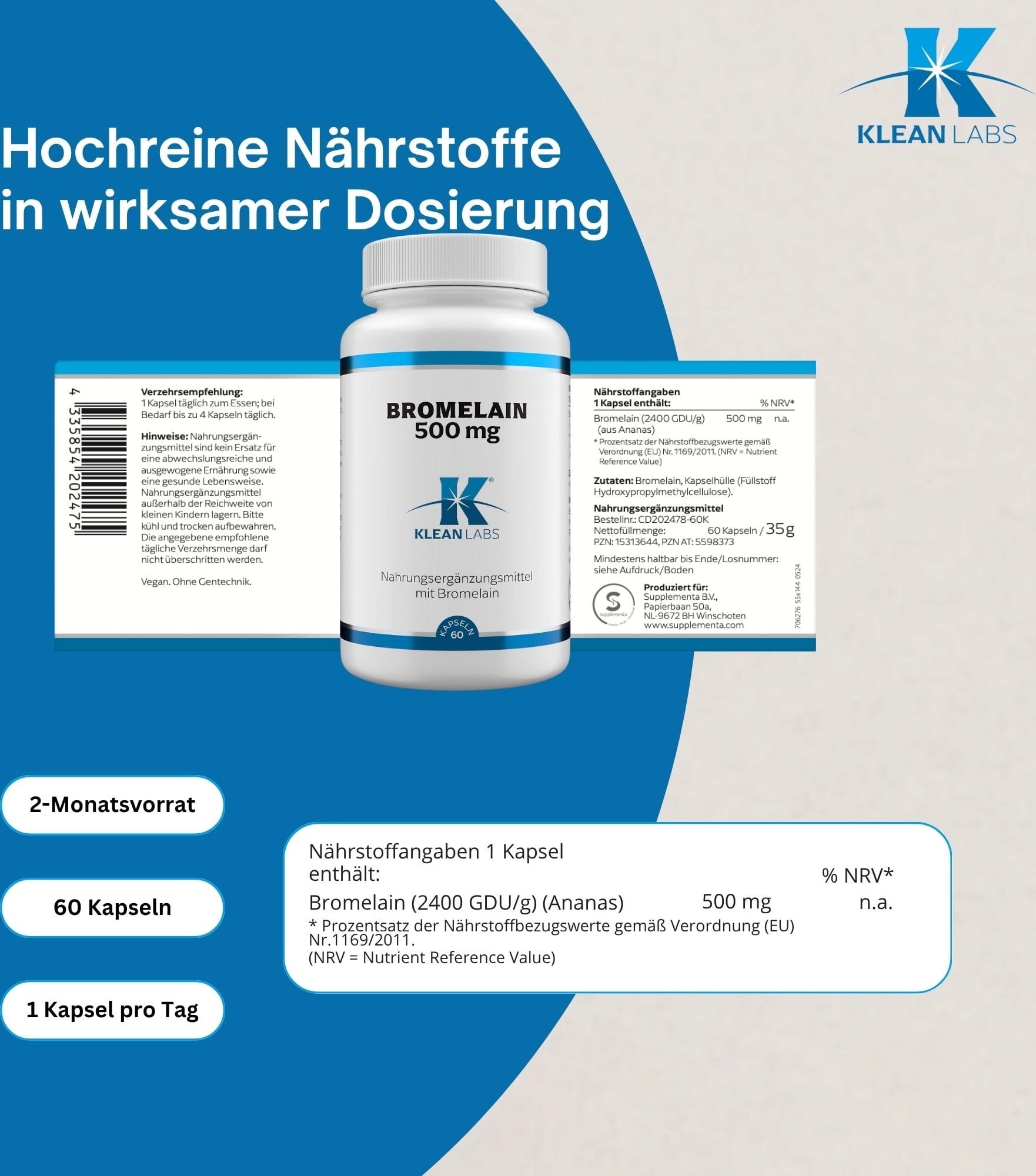 - This dietary supplement contains 500 mg bromelain per capsule, is 100% vegan and free of genetic engineering.