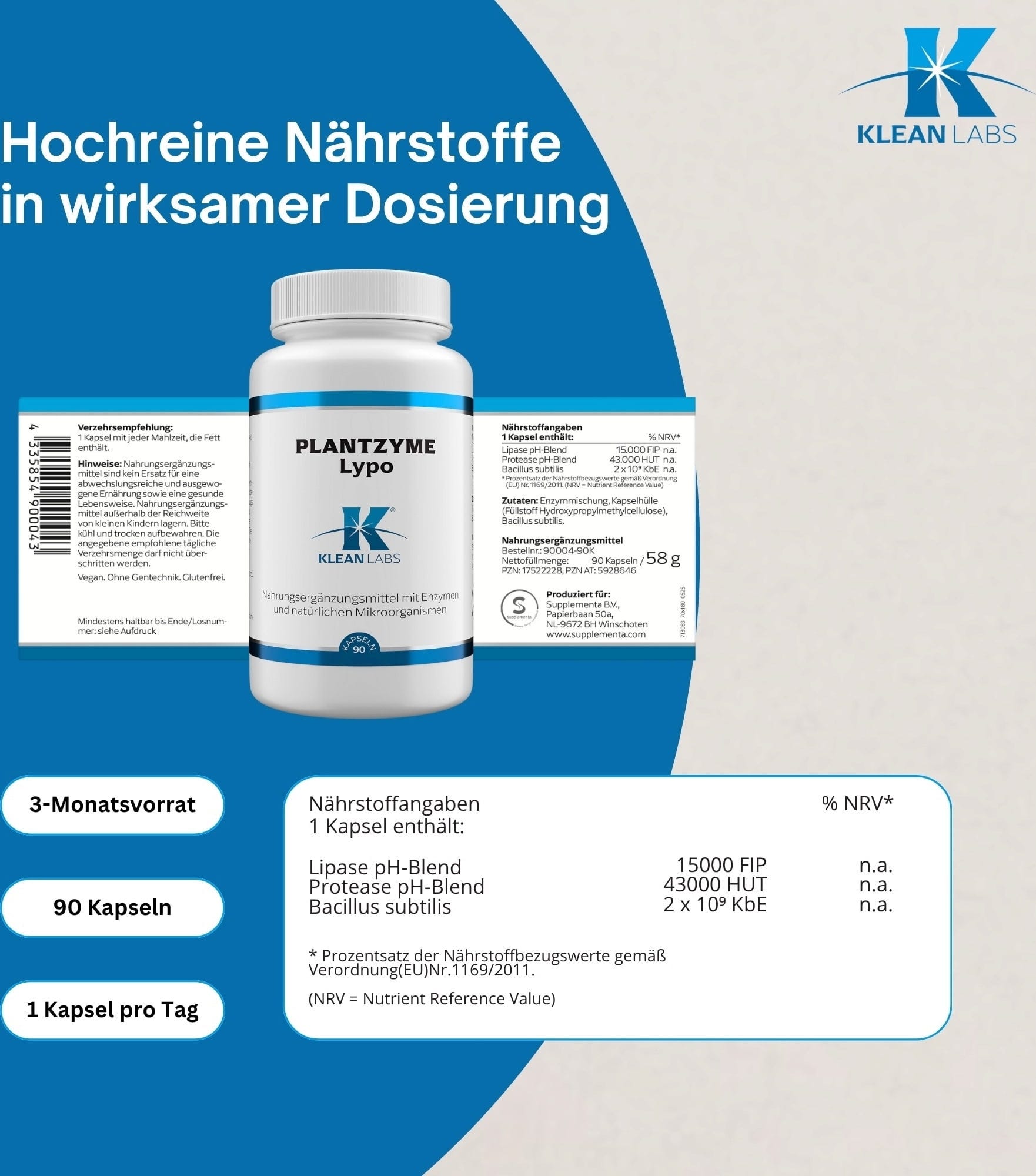 PlantZyme Lypo by KLEAN LABS is a targeted enzyme formula containing plant-based lipase, protease and Bacillus subtilis. This combination is particularly suitable for meals higher in fat or protein. The capsules are pH-stable, vegan and free from artificial additives.