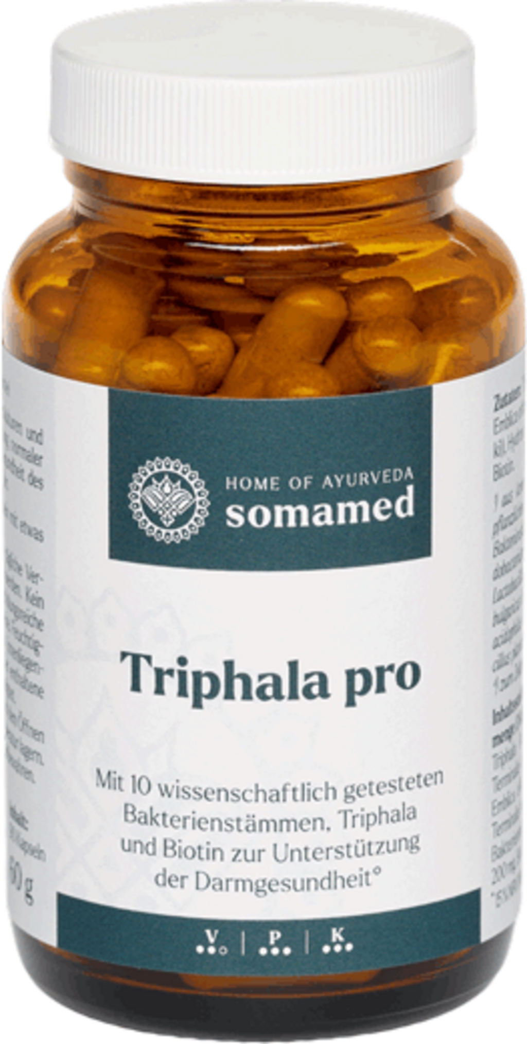 Triphala pro, developed by Dr Wolfgang Schachinger, MD, combines the traditional recipe for Triphala with a carefully composed mix of 10 selected bacterial strains and biotin. The unique combination of herbal ingredients and modern knowledge makes Triphala Pro a versatile product for a conscious diet. The mix of Haritaki, Amalaki and Bibhitaki (Triphala) is harmoniously supplemented with high-quality microorganisms and biotin. Ideal as part of a balanced diet.