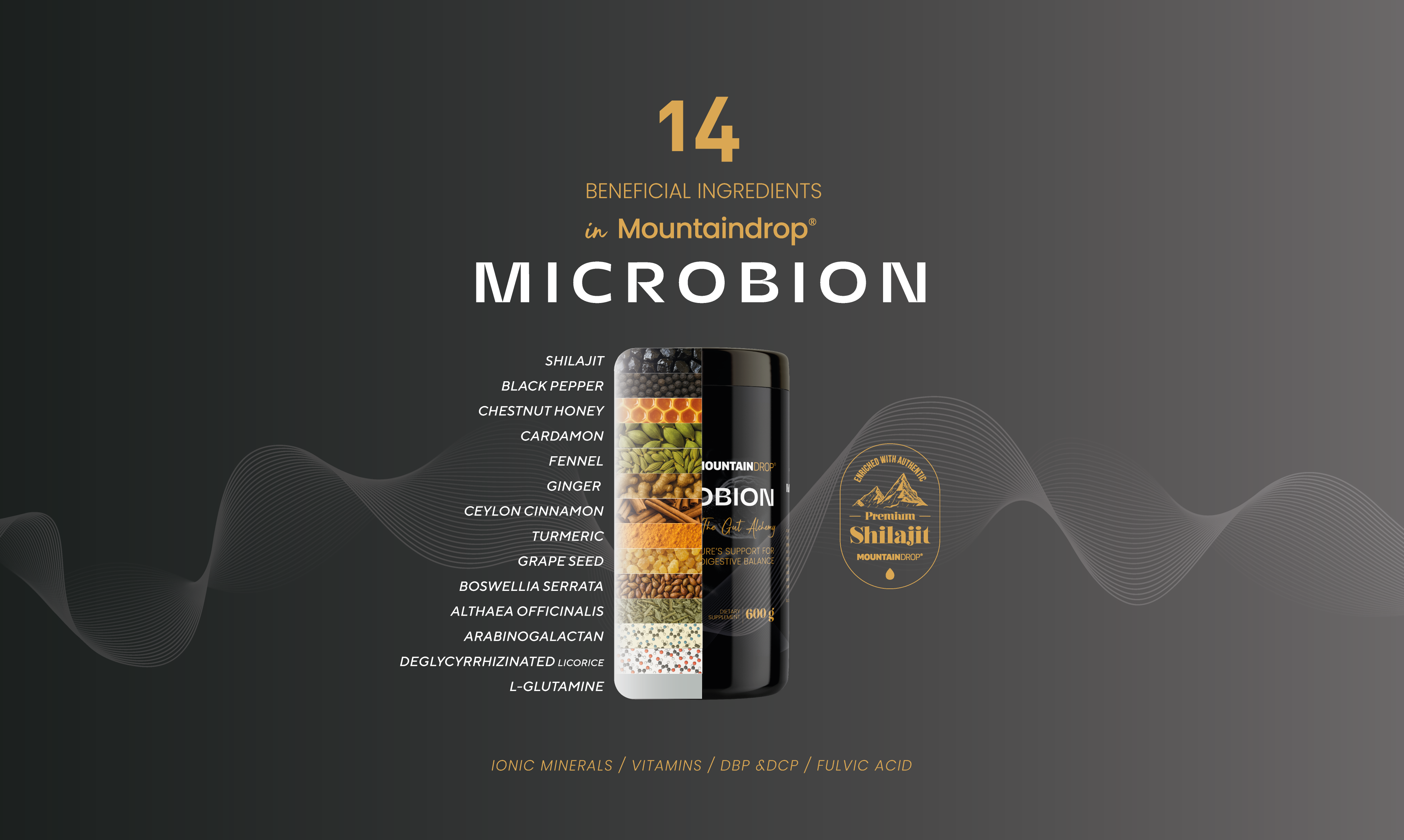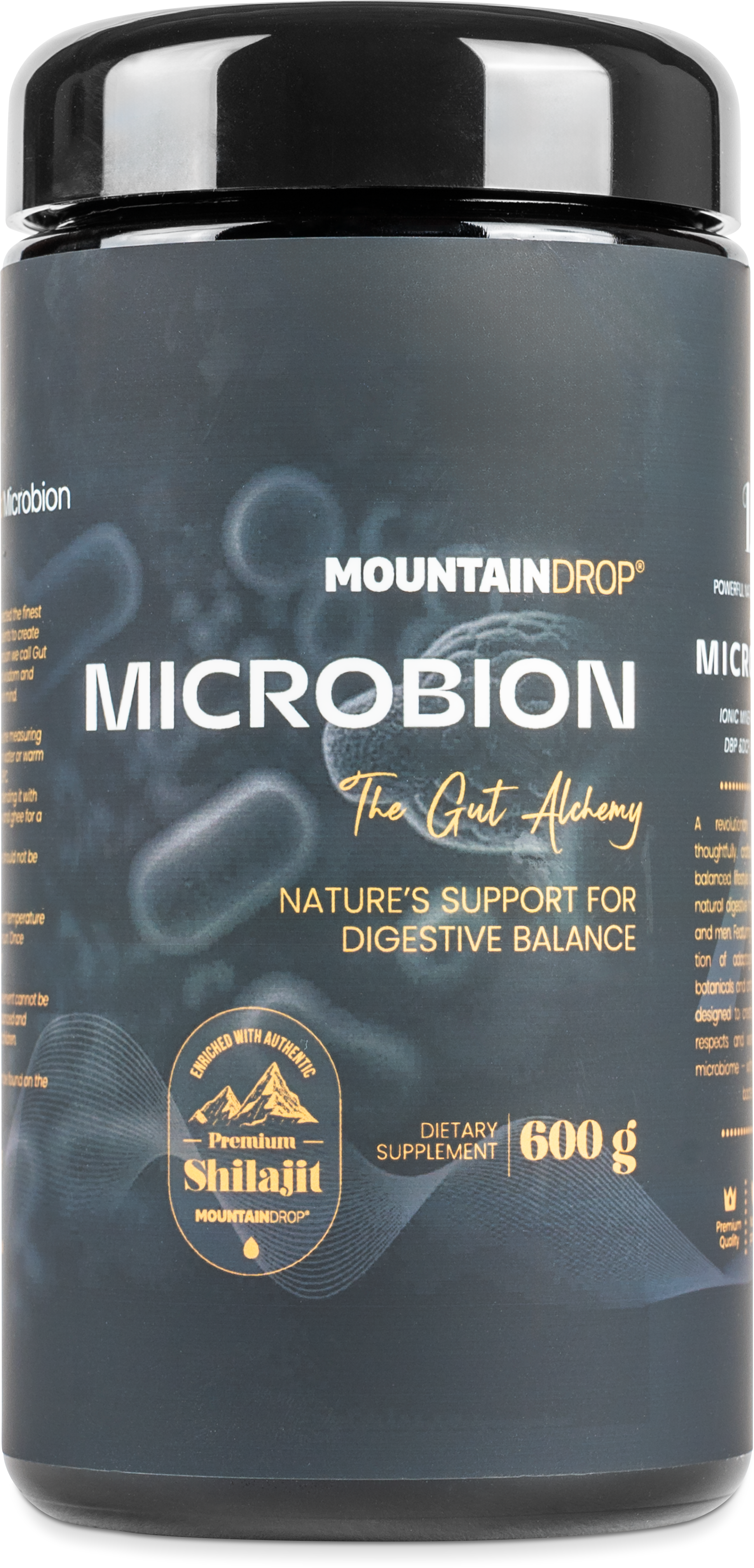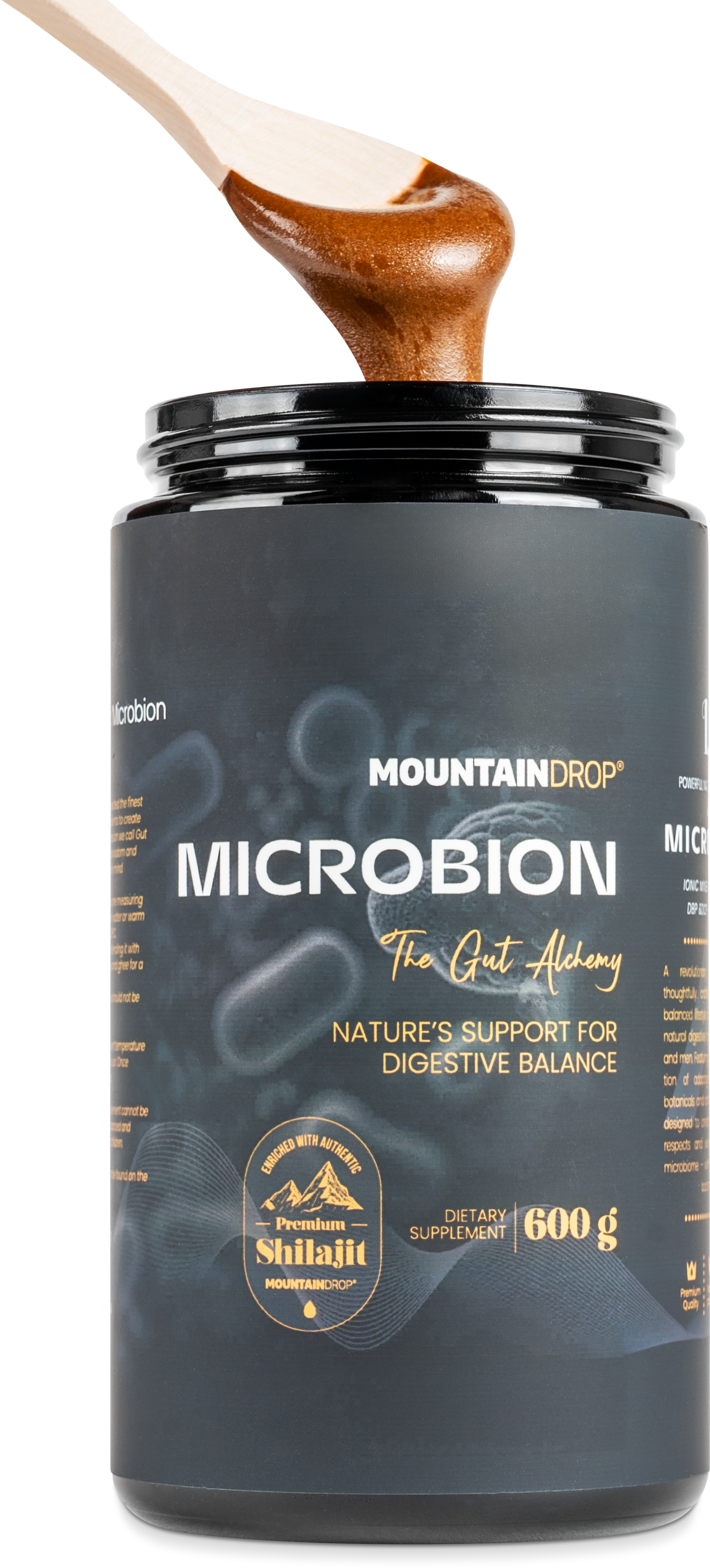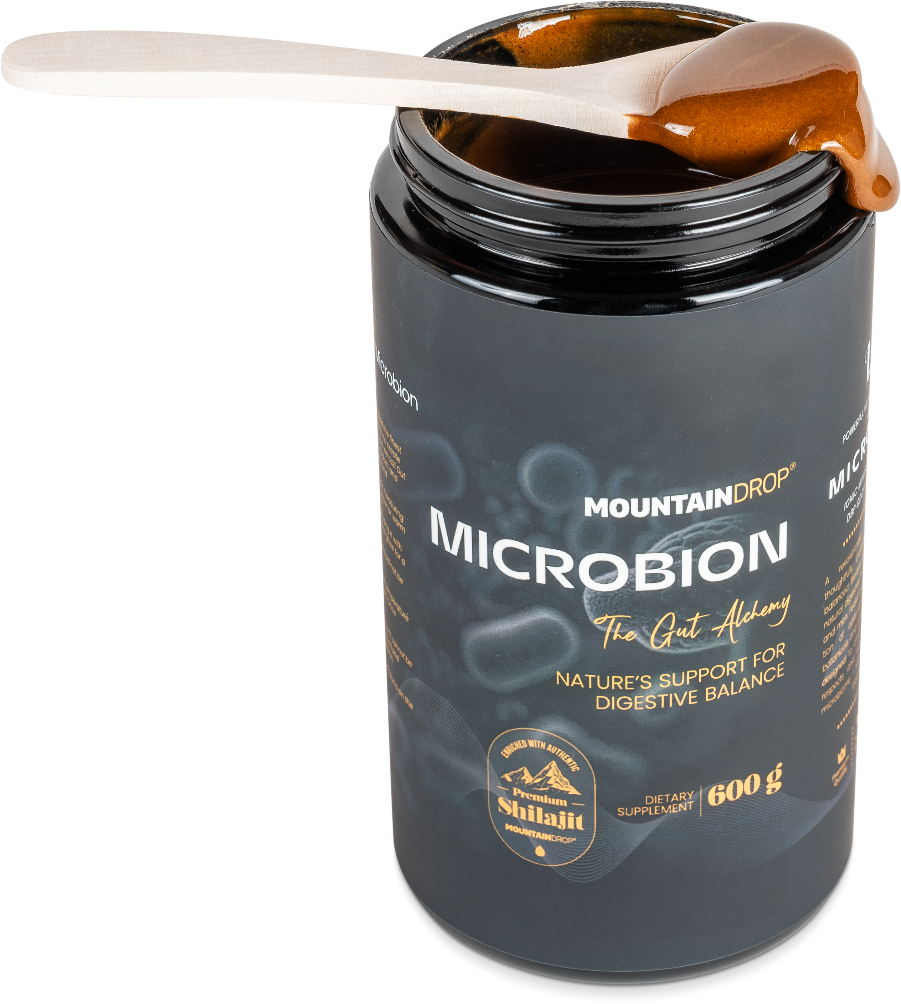 Microbion by Mountaindrop combines premium shilajit with a selection of 13 botanical components in a base of natural honey. It features a finely balanced matrix of prebiotic arabinogalactan and the amino acid L-glutamine, supplemented by traditionally valued extracts of turmeric, boswellia (frankincense), and ginger. Botanical ingredients such as marshmallow root and DGL liquorice round off the ingredients, along with grape seed extract. Black pepper is included to support bioavailability. Through gentle cold-processing in Slovenia, the natural structures of the resins and herbs are preserved.