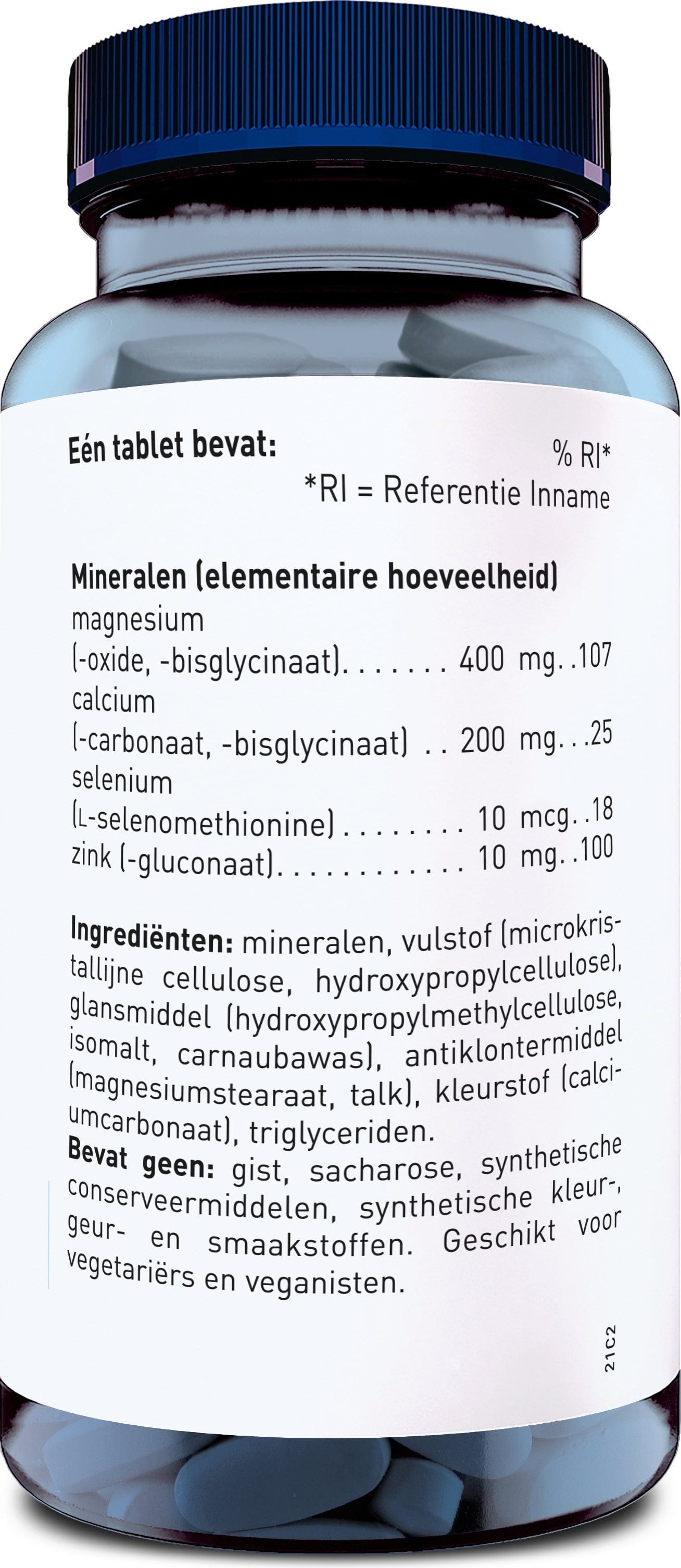 Magnesium (as Oxide), Calciumcarbonat, Magnesium bisglycinate, Calcium bisglycinate, Filler (Microcrystalline cellulose, Hydroxypropyl cellulose), Zinc gluconate, Coating (Hydroxypropyl methylcellulose, Isomalt, Carnauba Wax), Release Agent (Magnesium salts of fatty acids, Talcum), Dye (Calciumcarbonat), Trigylcerides, L-Selenomethionine