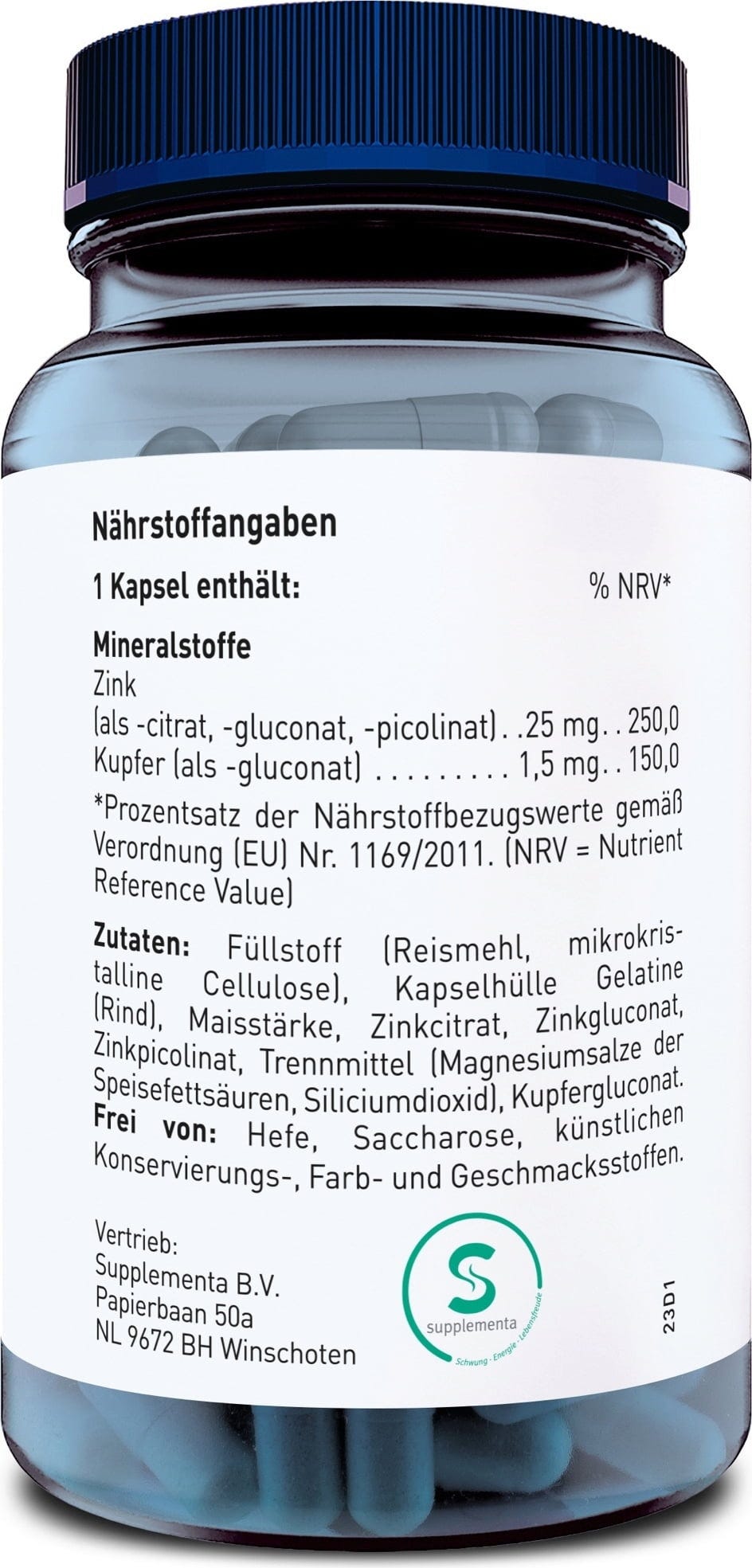 Filler (Rice flour, Microcrystalline cellulose), Capsule shell (Hydroxypropyl methylcellulose), Cornstarch, Zinc citrate, Zinc gluconate, Zinc picolinate, Release Agent (Magnesium salts of fatty acids, Silicon dioxide), Copper gluconate