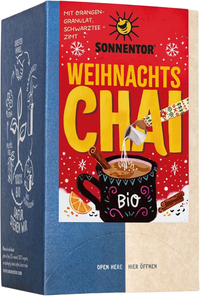 Switch on the fairy lights in your kitchen and bring that pure festive spirit right into your tea cup! This organic Christmas Chai from Sonnentor is the ideal companion for the cold season. Here, robust Assam black tea and warm, Christmassy spices such as cinnamon and cloves meet the sweet notes of liquorice and cocoa shells.