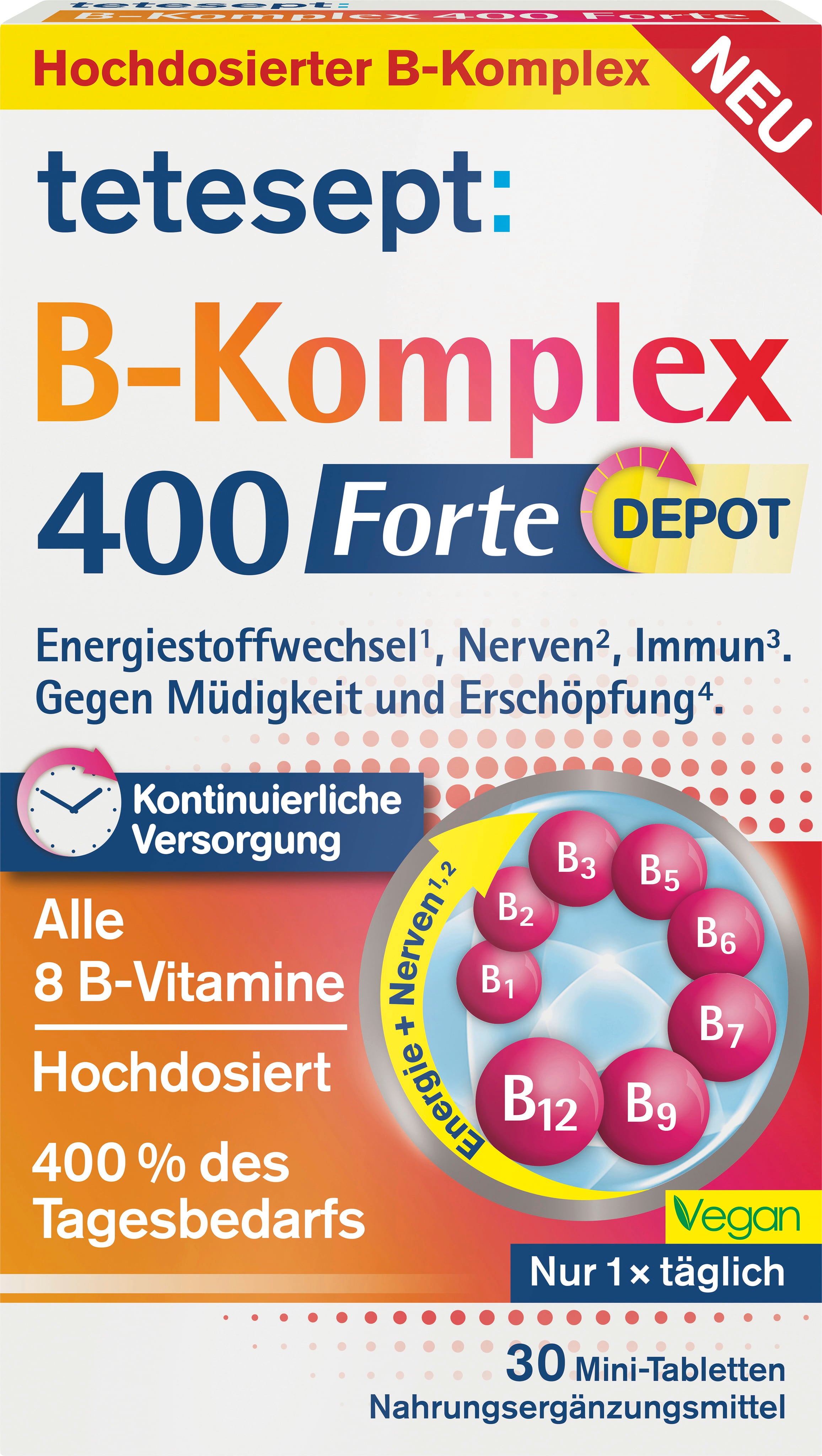 B-Complex 400 Forte by tetesept provides all 8 B vitamins, providing an optimal support for your body. The high-strength formula is vegan and free from gluten and lactose.