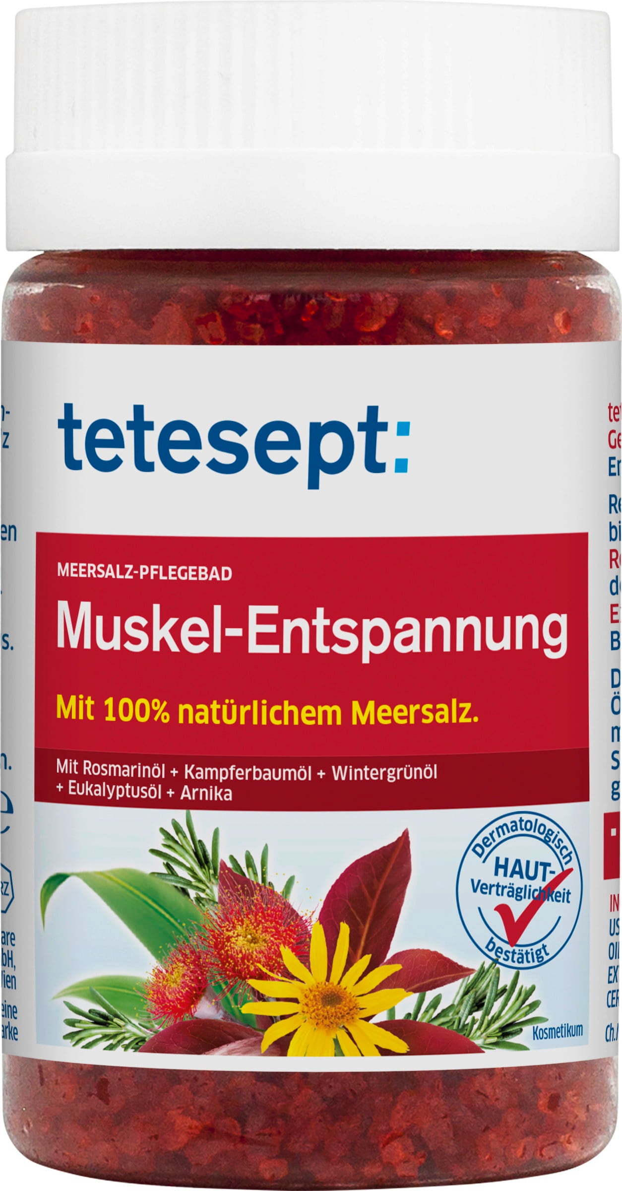 Have you worn yourself out from doing sports or hiking? Then give your body a break and look forward to the Muscle Relaxation Bath Salts by tetesept! This bath salt consists of 100 % pure natural sea salt and provides the skin with valuable care. Natural essential oils obtained from rosemary, camphor tree, eucalyptus and wintergreen, as well as arnica extract, provide a wonderful fragrance and unfold their positive properties.